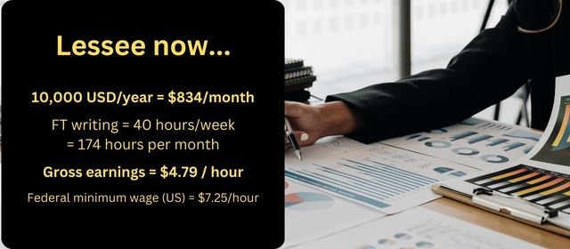 Even a traditionally published full-time author earning $20K a year from books and author-related income can legitimately question their career choices, don’t you think? That’s $9.58 an hour, which is better than minimum wage, but doesn’t go far.